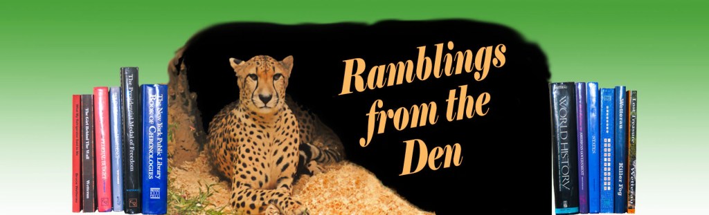 But wait, wait, there’s more to the more! The first issue of my free (and pretty irregular) newsletter, Ramblings from the Den, is here. Once every month or two, you’ll find my thoughts on the writing life, notes about me and my works in progress, news and views, book reviews, short stories, and whatever else comes to mind.